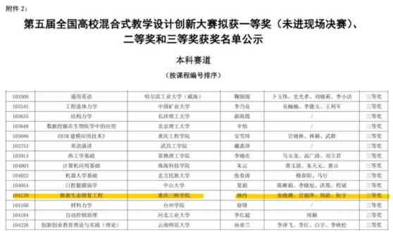 杨玲教师团队参赛的课程为《植被生态修复工程》,该课程是在学校绿色教育、创新教育和应用型转型背景下开设的专业特色课。课程依托学院科研团队关于三峡水库消落带植被生态修复研究成果,开展混合式创新教学设计。3年的混合式教学始终以员工为主体,员工无论是综合成绩,还是专业技能、综合素质都得到有效提升。《植被生态修复工程》课程也于2023年荣获第五届全国高校混合式教学设计创新大赛三等奖,并立项为2023年重庆市一流课程。