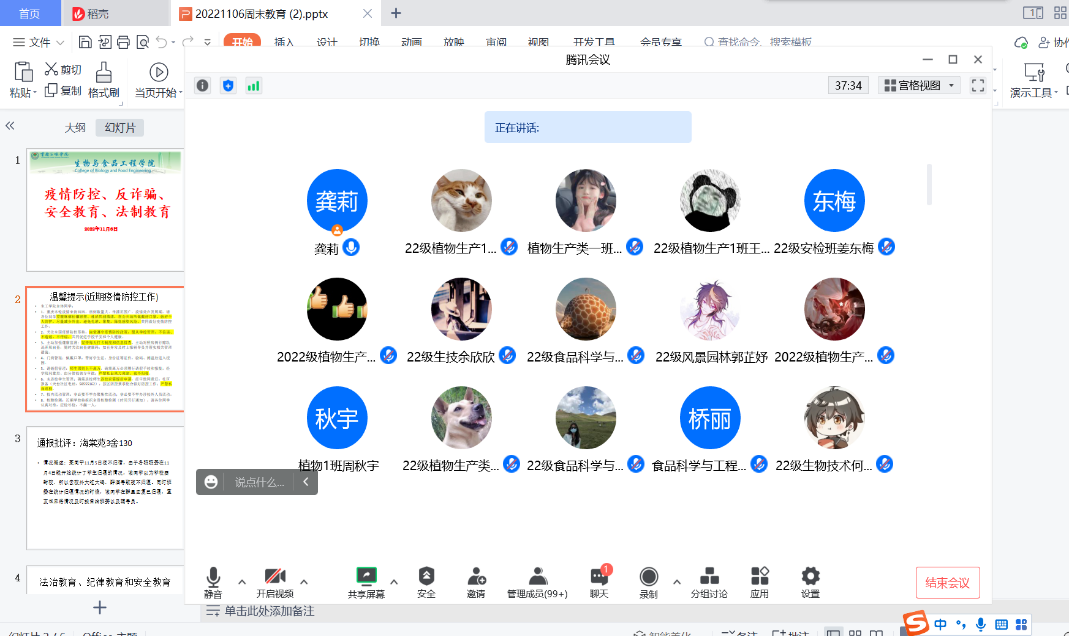 会上,辅导员结合疫情情况分析了近期疫情形势的严峻性,引导同学们正确认识疫情防控形势,提醒同学们做好个人防护,做到减少外出、不聚集、不信谣、不传谣,严格遵守学校疫情防控政策;从真实的诈骗案例出发,教育引导同学们在生活中保护好个人财产,不轻信、不转账、不上当,切实提升防诈骗能力;鼓励同学们继续加强自然灾害防范安全知识的学习,注意人身财物安全,提升安全和法治意识,有效防范化解各类安全风险;结合成人高校招生考试,强调考试纪律性,希望同学们遵纪守法,严禁充当考试“枪手”或者参与作弊活动。