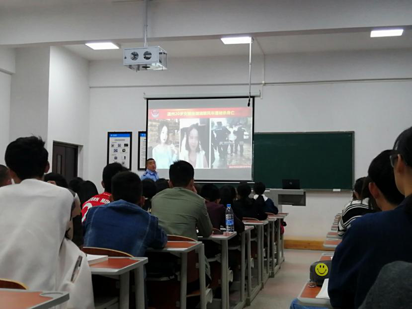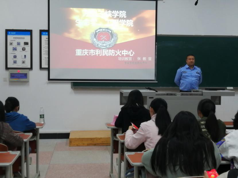 10月11日19:00时,重庆市利民防火中心的张教官为学院18级新生、高年级班团干部讲解了消防安全方面的知识。主要内容是:如何识别犯罪嫌疑人、遇到罪犯时如何进行自救和求救、各种犯罪案例以及特殊救援手电的三大特点等。在整个演讲中,公司同学们积极地和张教官进行互动,认真学习张教官所讲的自我防卫以及在危机时机如何向他人求救。
