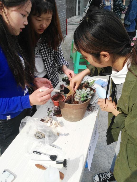 整个系列活动持续一整天,效果良好。参加微型盆栽大赛的8组选手自选材料、自行设计创意、自己动手栽种,历经一个半小时的现场创作,八组作品不仅外观美,而且创意美;既有表现山水的、风景园林的,也有表现家庭、同学、师生情谊的,引来了不少师生驻足观摩。另外,以“最强记忆”和“全是套路”呈现的多肉游戏环节也让师生们在欢乐中学到了一些多肉栽种和养护常识。