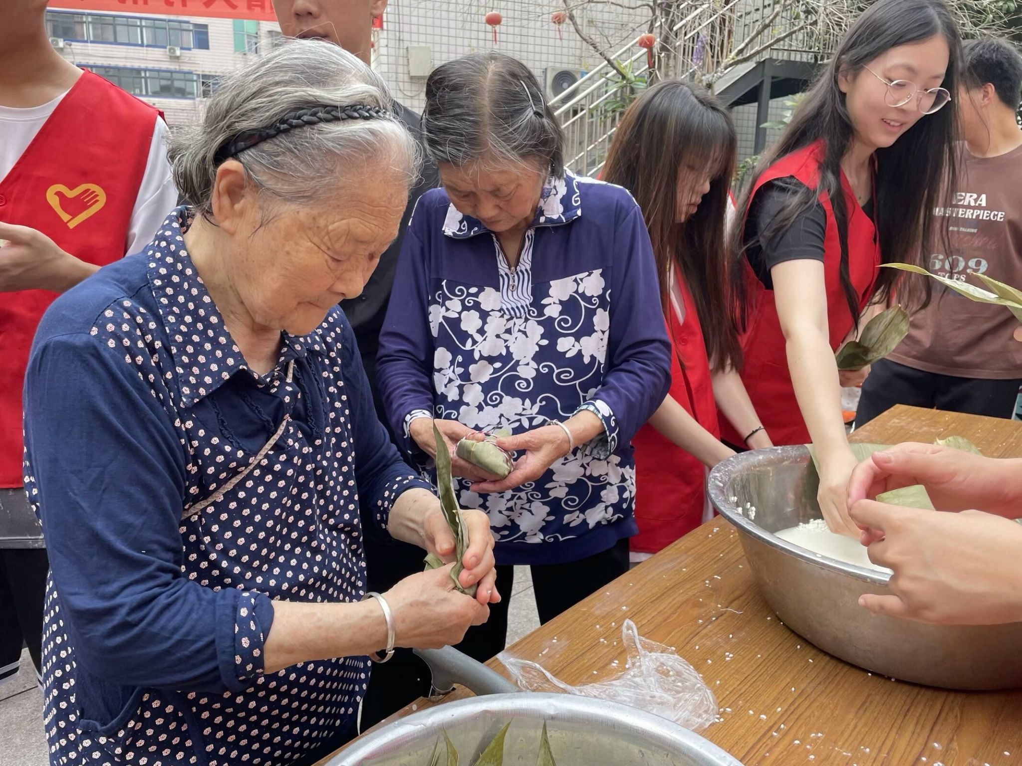 活动当天,志愿者们与老人共同包粽,镜头记录着“三角粽”传统手法,叠叶翻飞间流淌文化薪火。之后,志愿者们为老人推拿肩颈,“力道可好?”的温声伴着专业手法,一捏一放皆藏心意,让志愿者们与老人在互动中感受文化传承的温度。